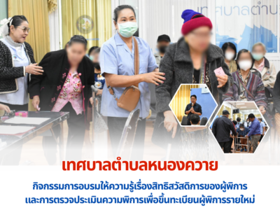 วันที่ 29 มกราคม 2569 เทศบาลตำบลหนองควาย ได้ดำเนินกิจกรรมการอบรมให้ความรู้เรื่องสิทธิสวัสดิการของผู้พิการและการตรวจประเมินความพิการเพื่อขึ้นทะเบียนผู้พิการรายใหม่ ภายใต้โครงการส่งเสริมป้องกันและฟื้นฟูสมรรถภาพคนพิการตำบลหนองควาย ปี 2569 (กองทุน สปสช.) ณ ศูนย์พัฒนาคุณภาพชีวิตผู้สูงอายุและส่งเสริมอาชีพผู้สูงอายุเทศบาลตำบลหนองควาย (ศพอส.) ทั้งนี้ได้มีประชาชนผู้ที่มีความประสงค์เข้ารับการตรวจประเมินคัดกรองเป็นจำนวนมาก สำหรับกิจกรรมดังกล่าวมีนายณรงค์ ธิลา นายกเทศมนตรีตำบลหนองควาย/ประธานศูนย์บริการคนพิการ คณะผู้บริหาร สมาชิกสภา อาสาสมัครดูแลคนพิการ เจ้าหน้าที่จากสำนักปลัดและกองสาธารณสุขและสิ่งแวดล้อมอำนวยความสะดวก ลงทะเบียน รับบัตรคิว ชั่งน้ำหนัก วัดความดันโลหิต ลงข้อมูล ถ่ายรูปติดบัตร และเก็บรวบรวมเอกสารเพื่อยื่นขึ้นทะเบียนเป็นผู้พิการรายใหม่ ปี 2569 ณ พมจ.เชียงใหม่ต่อไป