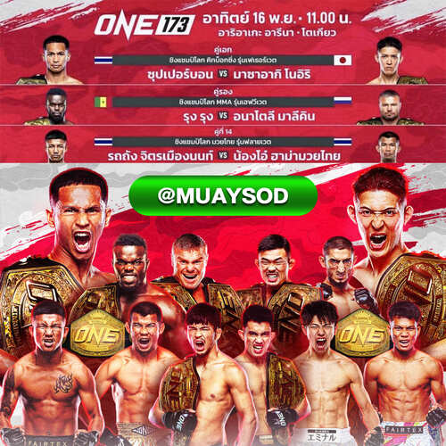 เว็บ แทงมวย @muaysod ที่เปิดให้แทงมวยวัน One Championship แบบสดๆ ครบทุกคู่ แทงได้ทุกคู่ ราคาเริ่มต้นที่ 10 บาทต่อคู่ ไม่ว่าคุณจะเป็นแฟนมวย แทงยกต่อยก เสมอ ไล่ลง ไม่คิดเงิน สเต็ปมวยไม่ตาย สเต็ปมวย ผสมกันได้ 1 -10 คู่ แอดมินบริการ ตลอด 24 ชม