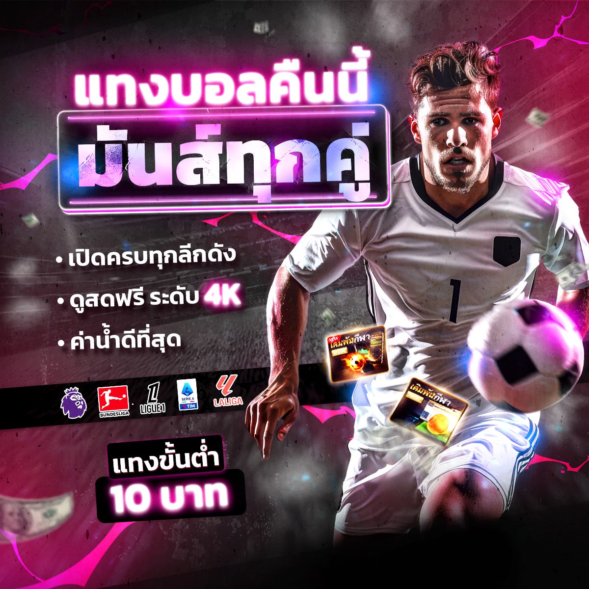 - โปรโมชั่น เดิมพันขั้นต่ำ 10บาท สามารถแทงบอลแบบราคาประหยัด ได้คุ้มค่าเหมาะกับ มือใหม่ที่เข้ามาทดลอง ทดสอบหรือจะ สายประหยัดงบมีจำกัด ก็คุ้มค่า เหมือนกัน